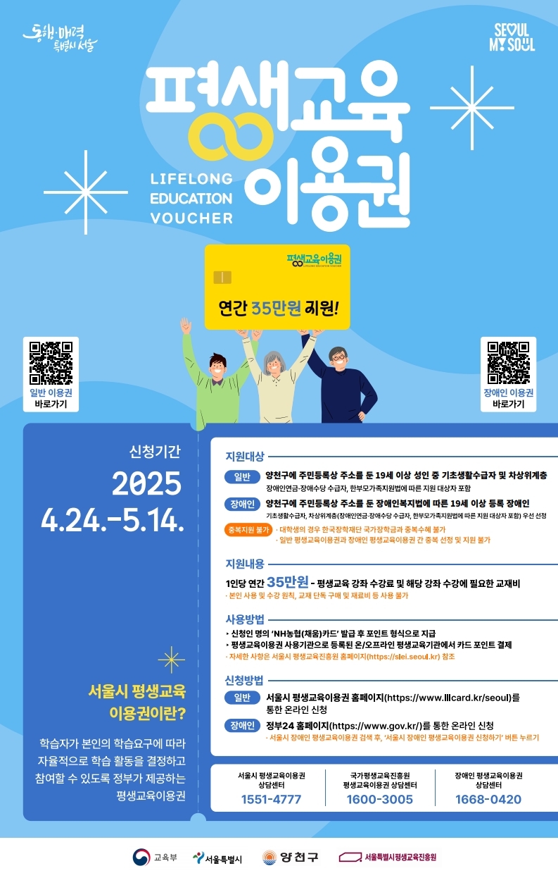 등록일 : 2025.04.23 조회수 : 2069회▶ 2025년 서울시 양천구 평생교육이용권 신청자 모집 ◀