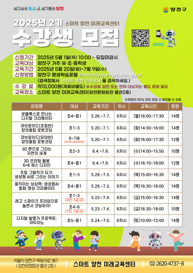 등록일 : 2025.05.02 조회수 : 228회「2025년 스마트 양천 미래교육센터 정기강좌 2기」 수강생 모집 안내